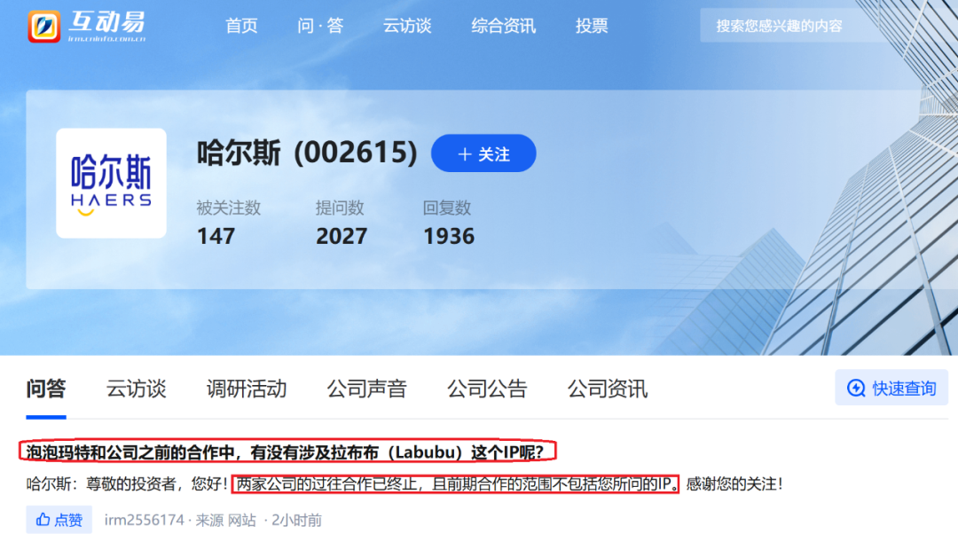 6月13日,哈尔斯在深交所互动易回复投资者问题时表示,与泡泡玛特的过往合作已终止,且前期合作的范围不包括拉布布这一IP。 哈尔斯在回复关于“泡泡玛特和公司之前的合作中,有没有涉及拉布布(Labubu)这个IP”的问题时做出上述回答。